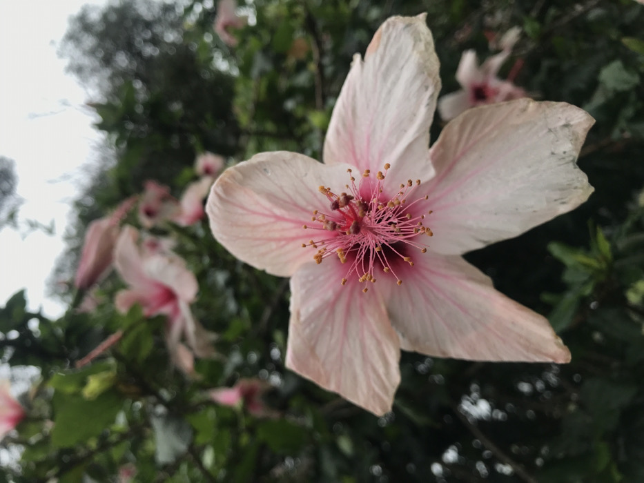 The image displays a close-up, front-facing view of a single light pink hibiscus flower, situated in Midrand, South Africa. The flower's five prominent petals exhibit faint darker pink venation, transitioning from a pale pink near the center to an almost white at the edges; some petals show minor dark discolorations and slight wear. A central column, also pink, extends outwards, terminating in a cluster of numerous golden-yellow anthers and reddish-pink stigmas. The background is significantly blurred, revealing additional pink hibiscus flowers in various stages of bloom and dark green foliage, suggesting a dense shrub or garden environment. The sky in the upper background appears overcast and bright. No individuals or direct actions are depicted.