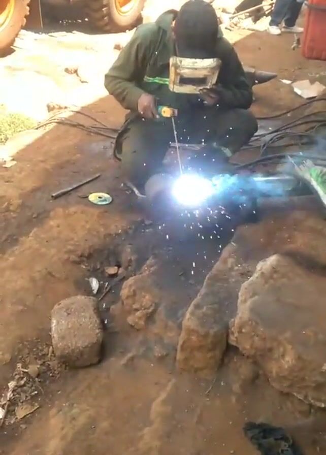 A person wearing a welding mask and green clothes is squatting and welding on a rocky dirt surface. Sparks and bright light are coming from the welding area. Various objects are scattered around, including a cutting wheel, cables, and a black cloth. In the background, there is construction equipment with large yellow tires, a motorcycle, and another person in blue pants. The environment appears to be an outdoor workspace.