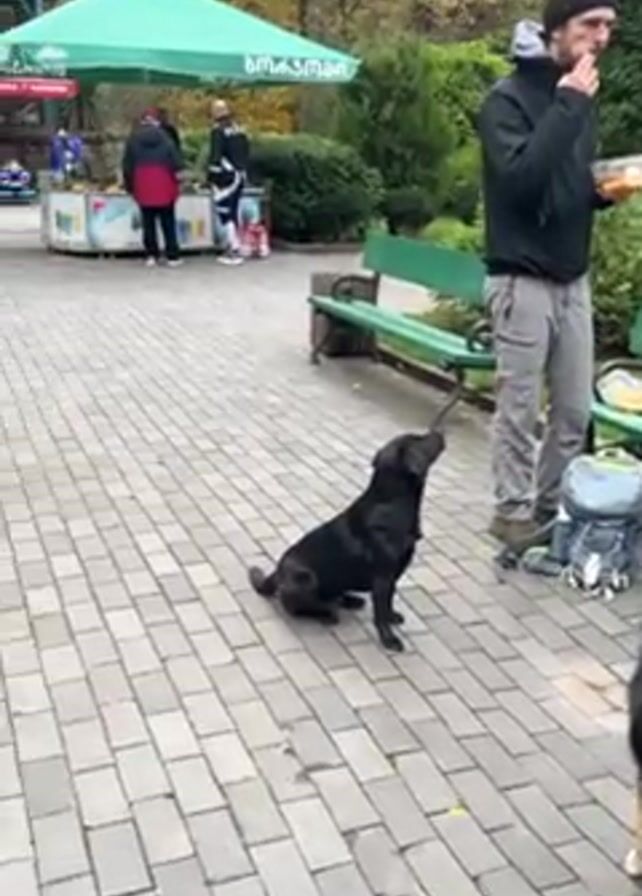 park with paved brick walkways, green benches, trees, and vegetation. A man stands on a brick path, holding a container and eating from it, with two dogs looking up at him. Another dog walks behind them. There is a small amusement area with colorful canopies and people in the background. The camera pans to show more of the park with a view of a hillside.