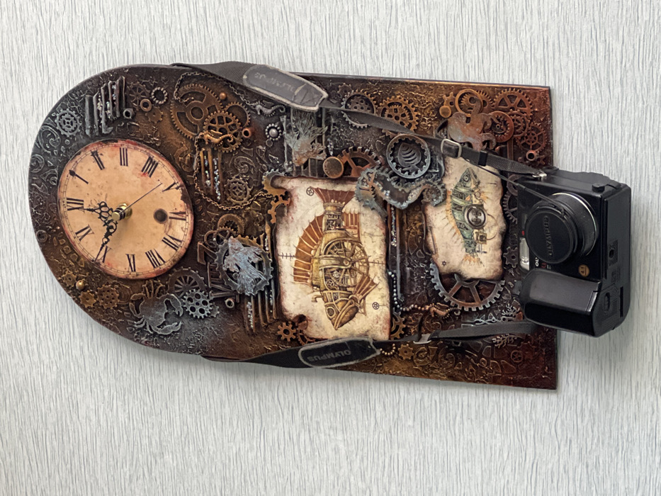 A Steampunk-themed mixed-media wall decoration is affixed to a light-colored, horizontally textured wall in Kambarka, Russia