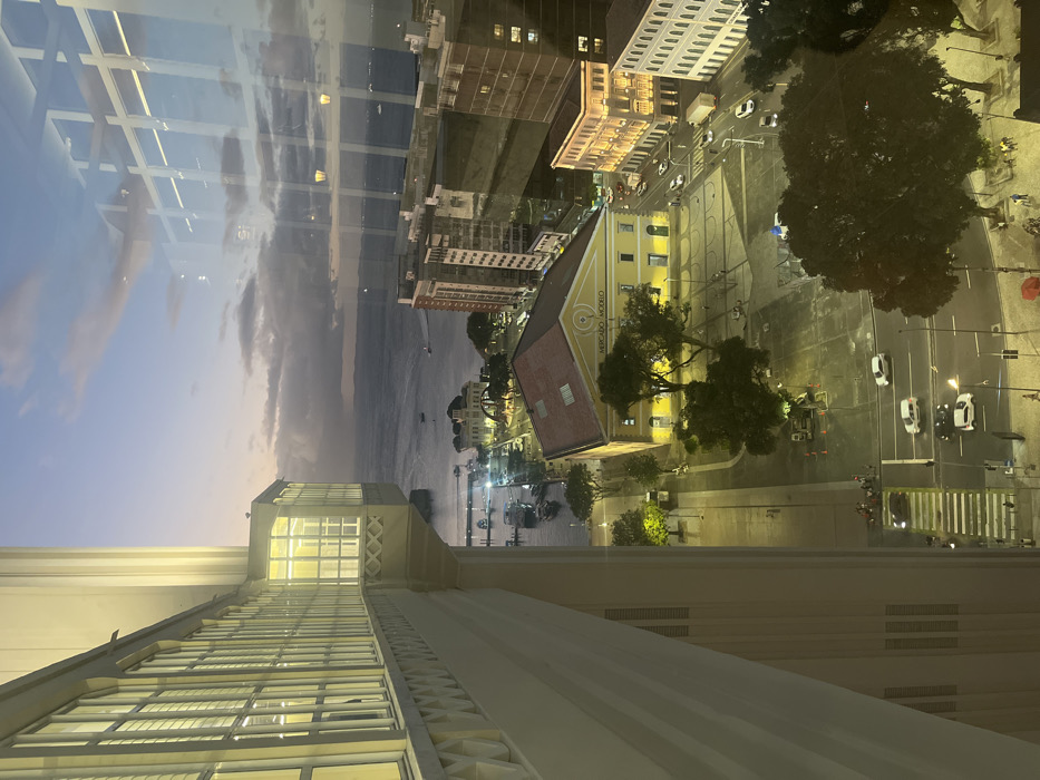 The image provides an elevated, dusk-time view of the waterfront in Salvador, Bahia, Brazil, specifically overlooking the Mercado Modelo and the Baía de Todos-os-Santos. The perspective appears to be from a building adjacent to or part of the Lacerda Elevator complex. In the immediate foreground on the left, a portion of a cream-colored, multi-story building is visible, featuring a long horizontal section with numerous windows and an illuminated enclosed balcony area projecting outward, supported by a decorative railing. The building's interior lights are active. The midground features the distinct yellow-painted Mercado Modelo building, with a dark red-brown gabled roof and a central circular facade displaying "MERCADO MODELO." This building is well-lit, casting light onto the surrounding area. In front of the Mercado Modelo is a large paved public square, mostly empty, with several dark green trees under artificial illumination. Beyond the square, a multi-lane street carries vehicular traffic, including several white and dark cars, and a light-colored truck. Streetlights illuminate the roadway. A zebra crosswalk is visible in the lower-left, where a small group of indistinct figures can be seen. Further into the midground, the Baía de Todos-os-Santos stretches across the scene. A pier with multiple small boats docked and moving is visible on the water's edge. Distant landmasses or structures are discernible across the bay under a twilight sky. The background consists of the bay merging with a horizon line under a sky transitioning from pale blue at the horizon to a darker blue-gray overhead, with scattered dark clouds. Artificial lights are visible across the distant bay and on the landmasses. To the right of the Mercado Modelo, various multi-story urban buildings with illuminated windows contribute to the city lights. Reflections of internal lights from the vantage point are visible on the glass through which the photograph was taken, particularly in the upper-right quadrant. The overall scene depicts an active urban environment transitioning into night, characterized by a mix of architectural structures, artificial illumination, and natural features.
