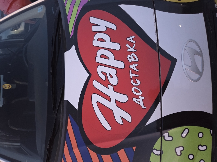 The image displays a close-up, frontal view of the hood and lower windshield of a Hyundai vehicle, situated outdoors in Sofia, Bulgaria. The vehicle's hood is covered by a multi-colored, pop-art style vinyl wrap. Centrally located on the hood is a large red heart, outlined in black and white. Inside the heart, white text reads "Happy" in English, positioned above "ДОСТАВКА" in Bulgarian Cyrillic, which translates to "DELIVERY." The surrounding wrap features various patterns: diagonal orange and blue stripes on the upper left, diagonal green and purple stripes on the upper right, and a green segment with white, irregular bean-shaped and circular motifs on the lower left. The silver Hyundai emblem is affixed to the lower center of the hood. Through the windshield, dark-colored front seats are visible, along with a yellow circular smiley face air freshener hanging from the rearview mirror. Two black windshield wipers rest horizontally at the base of the windshield. No individuals are present in the scene, and no specific street or landmark within Sofia is identifiable, though the Bulgarian text indicates its operational location.