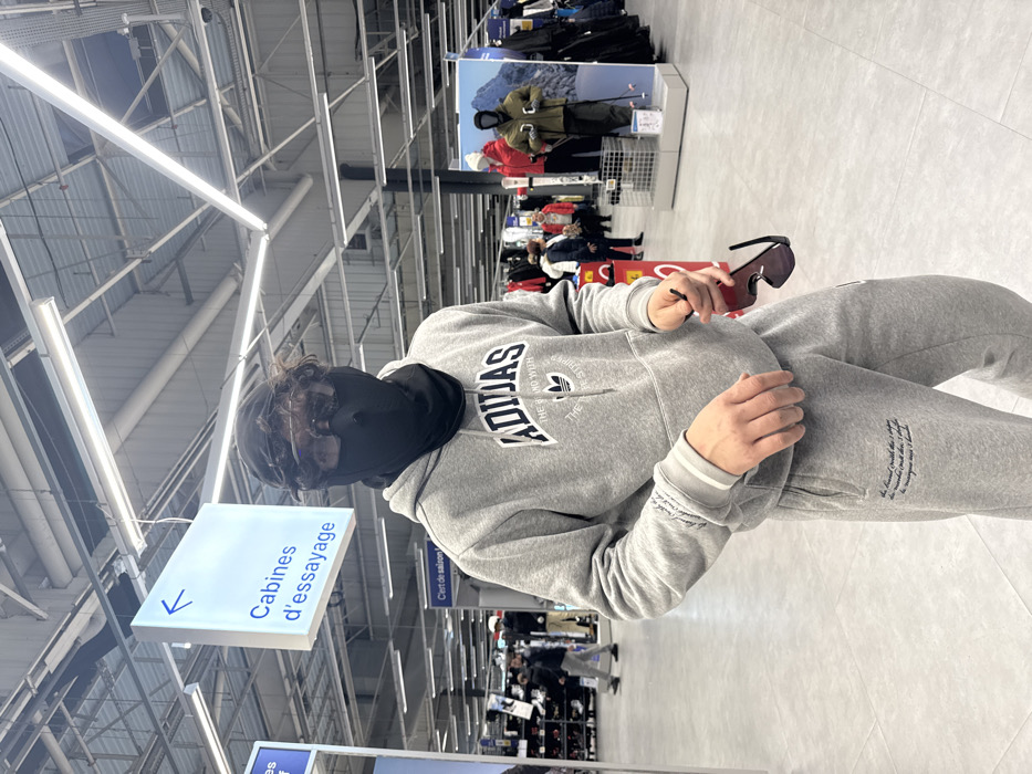 In a store, a person wearing a black face covering and sunglasses holds sunglasses. The person is wearing a grey Adidas hoodie and matching sweatpants with text on the leg. Overhead are signs indicating "cabines d'essayage" (fitting rooms) with an arrow. Racks of clothing are visible in the background, along with mannequins dressed in outerwear. The lighting is bright, and the floor appears to be a light grey tile.