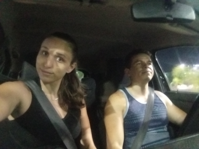 A woman with brown hair pulled back in a ponytail wears a black tank top with a seatbelt across her chest. She looks towards the camera with a slight smile. Next to her, a man driving the car wears a blue and white patterned tank top, also with a seatbelt. The car's interior is dark, illuminated by outside lights visible through the windshield. A rearview mirror is visible above.