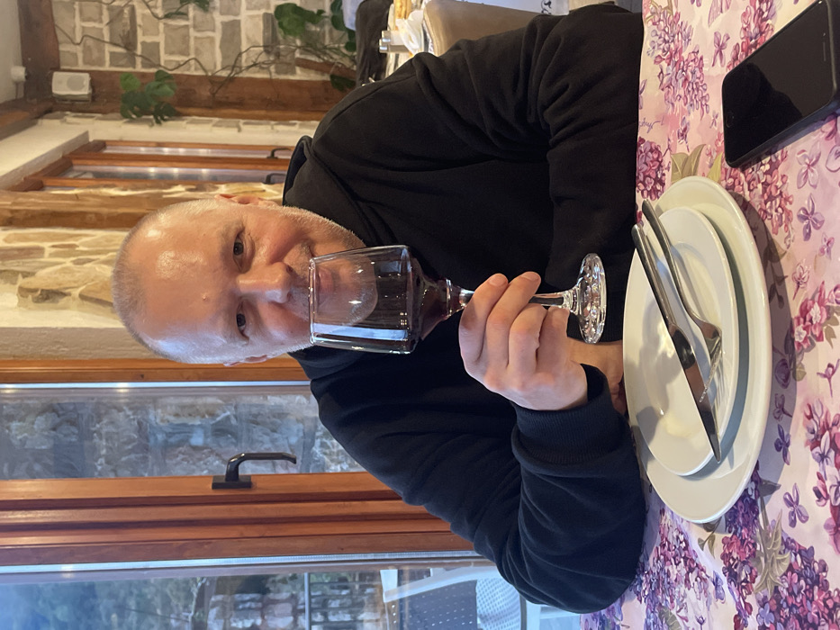 A male individual, appearing middle-aged with short light-colored hair and stubble, is seated at a table indoors. He is wearing a black hooded sweatshirt and holds a stemmed glass containing red wine with his right hand, positioned near his mouth. He is looking directly forward with a slight smile. The table is covered with a white tablecloth featuring a purple and green floral pattern. On the table, in front of the individual, are two stacked white plates with a silver-colored knife and fork resting on the top plate. A black smartphone in a black case is positioned face-down to the right of the place setting. The background on the left features a large wooden-framed window, revealing an exterior natural landscape with vegetation and visible outdoor seating. To the right, the interior wall is constructed of irregularly shaped natural stones, interspersed with wooden structural beams. Portions of an adjacent dining table with a white tablecloth and condiments are visible further in the background. The scene is located in the city of Podostrog, Montenegro.