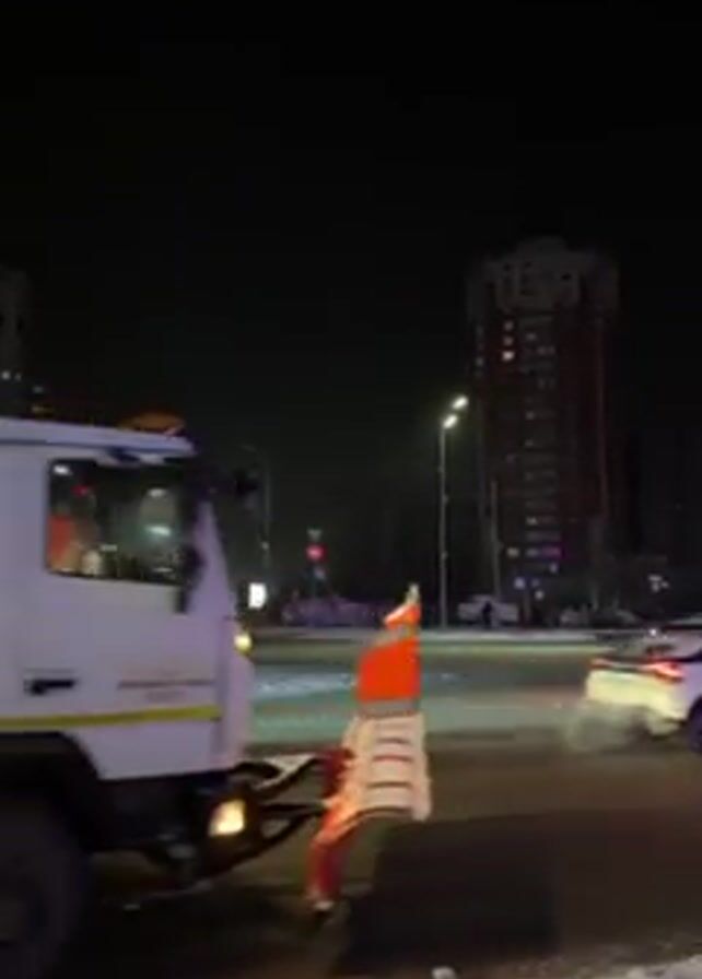 n intersection at night with a white passenger vehicle, a red and white salt truck, several other vehicles, and a tall building in the background. Snow is falling. The white vehicle passes through the intersection. The truck drives by, spreading something onto the street. A person in an orange safety vest stands near the edge of the road. Other vehicles are visible in the distance. The tall building has a sign with the word "NOVUS" on it.