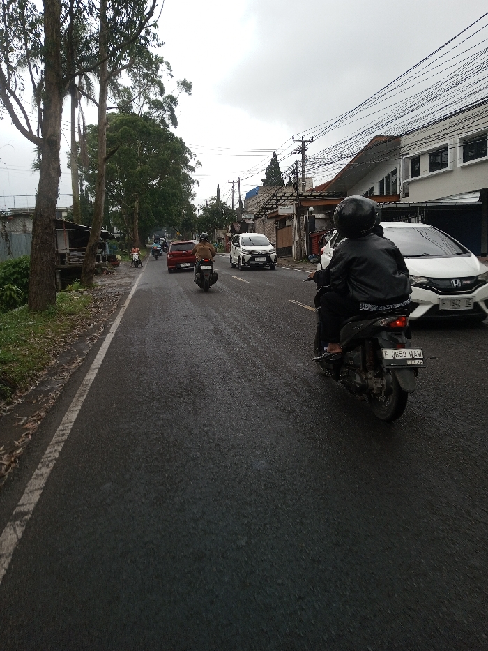 The scene depicts a street in the city of YonPhoogla, Bhutan, under an overcast sky. The asphalt road surface appears wet. In the immediate foreground, a black scooter with two occupants is observed from a rear perspective, heading away from the camera. The driver wears a black helmet and a black jacket. The scooter's rear license plate reads 'F 3650 WAW' with '07.28' printed below. To the right of the black scooter, a white Honda Jazz/Fit car with license plate 'F 1842 IE' is stopped or parked, also facing away. Further down the road in the same lane, a person on a brown scooter, wearing a helmet and a brown jacket, is in motion. Behind this scooter, a red sedan is visible. In the opposing lane, a white SUV or minivan is approaching. The left side of the road is bordered by a white solid line and features tall, slender trees with sparse foliage. Beyond the trees, basic structures with corrugated siding are partially visible. The right side of the street is lined with various buildings, including a prominent white multi-story structure with multiple windows. Numerous utility poles supporting a dense network of overhead power lines are visible along this side of the road.