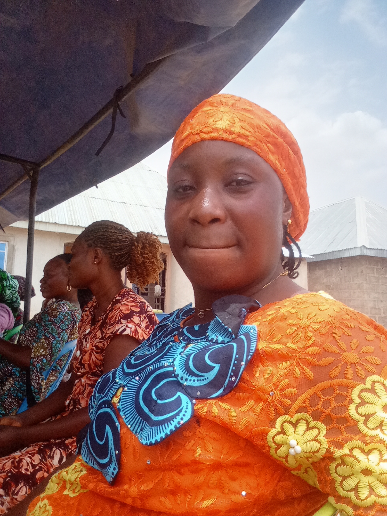 A woman in an orange headscarf and embroidered orange top with yellow floral accents sits outside in Doma, Nigeria