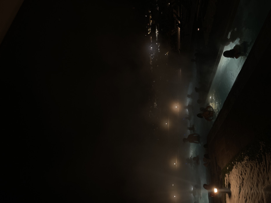 A nighttime scene depicts people bathing in an outdoor pool. Wisps of mist or steam rise from the water's surface, illuminated by submerged lights. The edges of the pool are visible, lined with snow. Figures are silhouetted against the dimly lit background, some standing near the pool's edge and others submerged. Above, faint building structures and lights are visible.