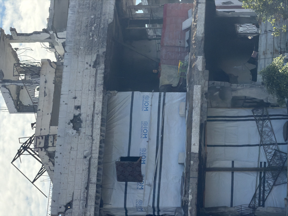 A partially destroyed building stands, featuring visible rubble and damage. Sections are covered in white tarpaulin with the logo "IOM UN MIGRATION." A dark figure is seen inside the building's interior. The building's skeleton and some of its exterior remain, with sections open to the sky. Wrought iron elements are visible. The image captures the aftermath of destruction and an effort at temporary repair or shelter.