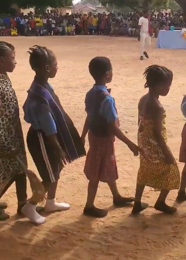 group of children walking in a line on a dirt ground. There is a crowd of people in the background and a table draped with yellow fabric. Most of the children are wearing patterned clothing, some are wearing school uniforms. A man in a white outfit and hat walks alongside the children with a microphone. It appears to be some sort of performance or event.