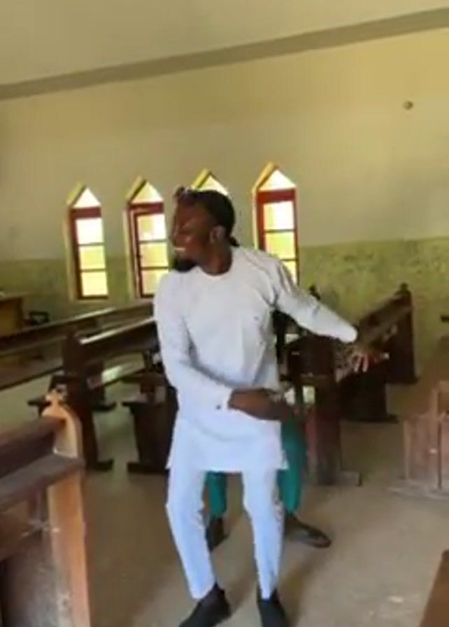 Inside a church, a man in a white outfit and sunglasses dances in the aisle between pews. Another man, wearing a green shirt, is behind him, occasionally leaning forward. The church has rows of wooden pews, a white ceiling, and pale green walls. Light streams in through three arched windows on the wall. The floor appears to be concrete. Music plays in the background.