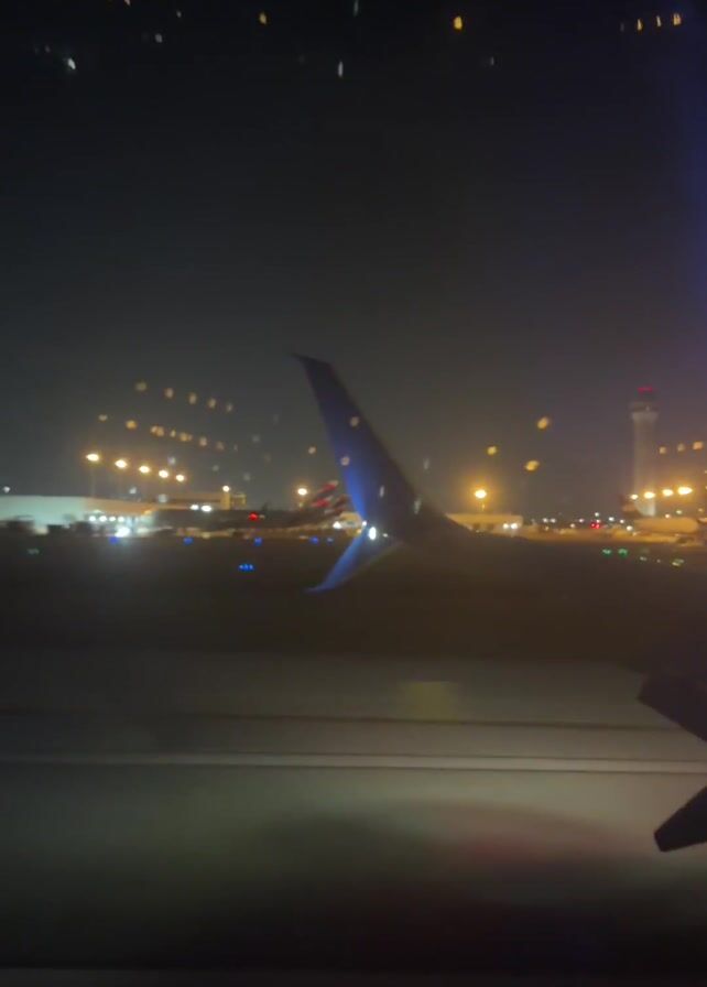n out-of-focus view from the window of an airplane at night. A wing of the plane is visible. In the background, there are airport lights and the faint silhouette of what appears to be an air traffic control tower. The overall visibility seems low due to fog or darkness.