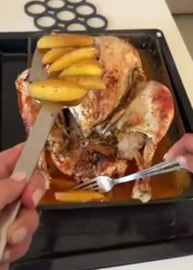 roasted turkey with cooked potato wedges in a glass baking dish. The dish is placed on a black baking sheet. A person uses a spatula to hold a potato wedge while picking it with a fork. The turkey appears to be mostly eaten. The shot is close-up and the lighting is bright, showing the crispy skin of the turkey and the golden color of the potatoes. The setting appears to be a modern kitchen with white countertops and cabinets.