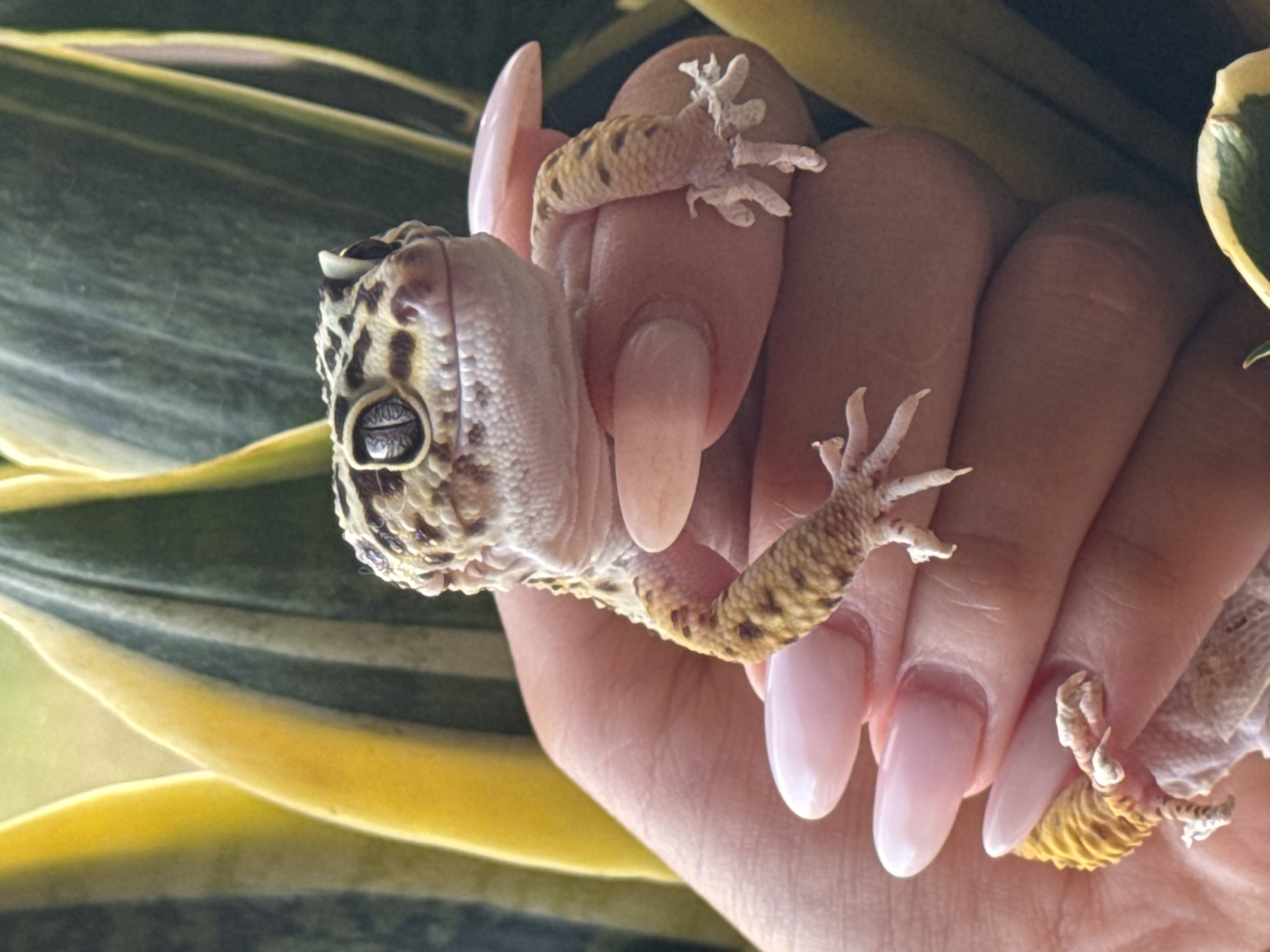 A leopard gecko perches on a person's hand, which is adorned with long, almond-shaped nails