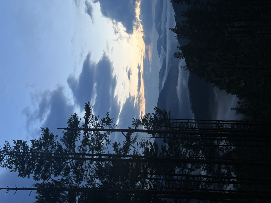 The image presents an outdoor natural landscape captured during low light conditions, indicative of either dawn or dusk, from an elevated perspective in the vicinity of Gradat, Bulgaria. The sky transitions from a warm, pale yellow-orange glow at the distant horizon to a deep blue overhead, partially covered by scattered cumulus and stratocumulus clouds in various shades of grey and blue. In the immediate foreground and along the left vertical axis, numerous tall, slender coniferous trees, primarily pines, are depicted in dark silhouette against the brighter sky. Beyond the foreground tree line, a series of receding mountain ranges and hills are visible, partially enveloped by thick, low-lying fog or cloud banks that obscure the valleys and lower slopes. No human subjects, animals, man-made structures, or active interactions are observable within the frame.