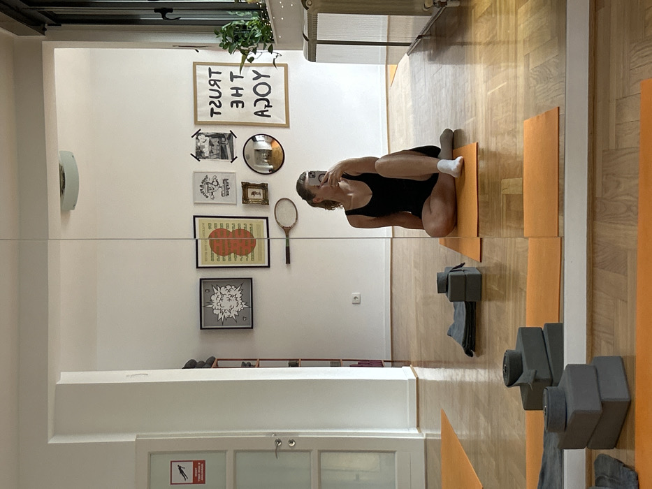 The image depicts the interior of a yoga studio or a dedicated exercise space, viewed as a reflection in a large, floor-to-ceiling mirror. The location is identified as Belgrade, Serbia, based on the presence of a "ZABRANJENO SKAKANJE NA BALKONU" (No Jumping on the Balcony) sign on a white door to the left, and a Type F electrical outlet on the wall. In the reflection, a female individual with light skin and light hair is seated on an orange yoga mat, positioned slightly to the right of the image's vertical center. She is wearing a dark, sleeveless garment, possibly a leotard or short dress, with a white sock on her right foot, her left foot being bare. Her legs are bent, with her right leg resting over her left, and she is holding a light-colored smartphone with both hands, using it to capture her reflection. The floor is a reflective, light-brown parquet. To the left of the seated individual on her yoga mat, a stack of three gray yoga blocks and a folded dark gray towel are visible. Another orange yoga mat is visible to the right of her, partially extending out of frame. The background wall is white and adorned with various framed artworks and objects. From left to right, these include: a framed black and white pop-art style image of an explosion; a framed orange poster with vertical lines of text; a small white poster with a cartoon character; a small black and white photograph taped to the wall; a small ornate framed picture; a round convex mirror; and a vintage wooden tennis racket mounted horizontally. To the far right of this arrangement, a large, vertically oriented poster reads "TRUST THE YOGA" in stylized, handwritten text. On the far right side of the image, beyond the mirror's edge, a large window or glass door with a dark frame is visible, admitting natural light. Below the window, a white radiator with a slatted top is installed. A small green plant and a string of fairy lights rest on the windowsill. On the far left, a white framed door with frosted glass panels features the aforementioned red and white "No Jumping" sign. A partial view of a tall, dark shelving unit is visible in the reflection to the left of the door. An electrical outlet is situated on the white wall below the framed artwork. The ceiling is white, with a circular light fixture reflected in the upper part of the mirror.