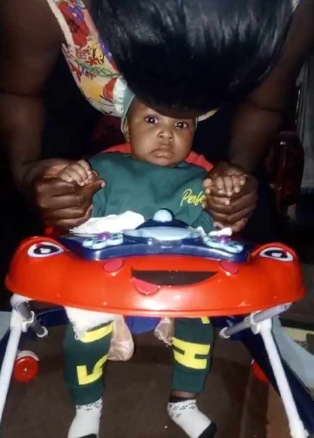 A video shows a baby in a walker. The baby is wearing a green shirt, a baby hat, and green and yellow leggings with white socks. An adult woman is behind the baby, holding the baby’s hands and leaning in to look at the baby. The walker is red, blue and white. The environment appears to be indoors.