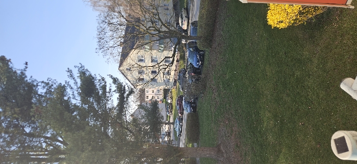 The image depicts a residential street scene in Gütersloh, Germany, viewed from an elevated perspective, likely a balcony or upper-story window. The foreground features a manicured green lawn, partially obscured by a white post with a square solar panel on its top left. A bright yellow flowering shrub is visible on the bottom right, adjacent to a red structural element. The midground transitions into a paved area, likely a street or parking lot, accommodating approximately 15 to 20 parked passenger vehicles of various makes and models, primarily sedans and hatchbacks, in colors including dark blue, silver, white, and maroon. No individuals are visible in or near these vehicles. A dense, dark green evergreen tree dominates the left side of the midground, with a bare deciduous tree situated more centrally. In the background, two multi-story residential buildings are visible under a clear, light blue sky. The prominent building on the right is a three-story structure with a sloped dark roof, light-colored facade, and multiple windows, some appearing partially open. Balconies with light-colored railings are affixed to its right side. A second, similar residential building is partially visible further back and to the left. The scene is illuminated by natural sunlight, casting shadows indicative of morning or late afternoon. No people or active interactions are observed.