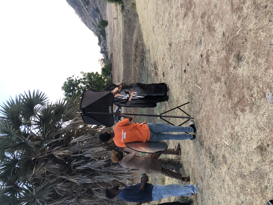 Outdoors, a woman in a long, black dress and striped top stands next to a man. A black Godox softbox on a stand is positioned to their left. Two men stand near them. One holds a reflector, wearing an orange shirt and blue jeans. Another man is nearby with a camera, wearing a tan shirt and tan pants. The sky is bright and the landscape is dry and grassy with a large tree to the left and a mountainous background.