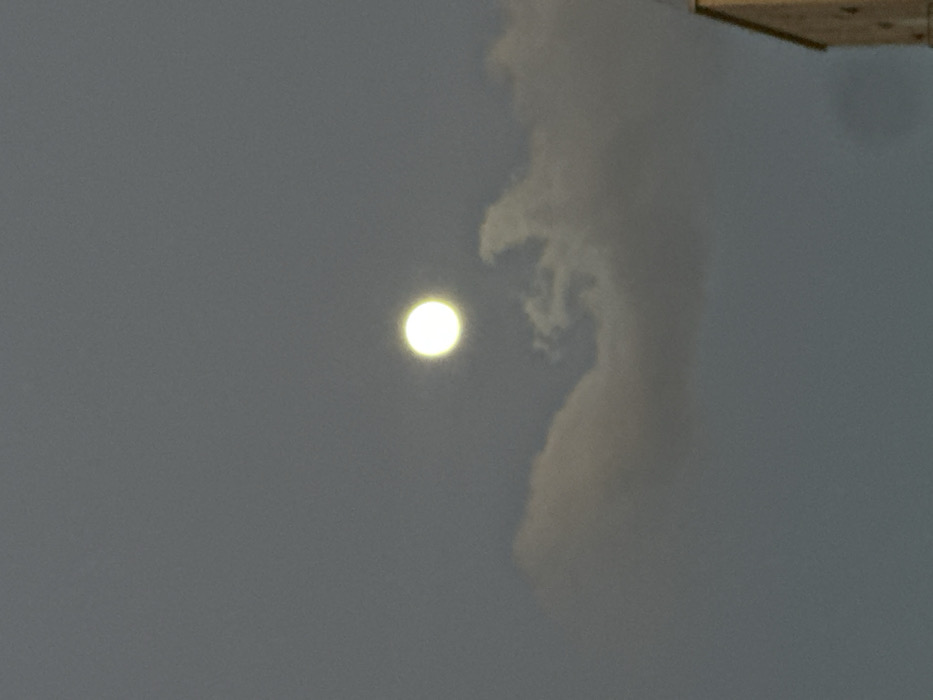 The image displays a sky view in Saint Julian's, Malta. A bright, circular, white-yellow orb is visible slightly above the vertical center against a dark gray sky. Multiple gray clouds are present in the lower half of the frame; one substantial cloud mass is situated below and to the right of the orb. The upper portion of a light-colored, possibly beige or pale brown, building is visible in the bottom right corner, showing a distinct architectural corner. No people or specific actions are discernible.