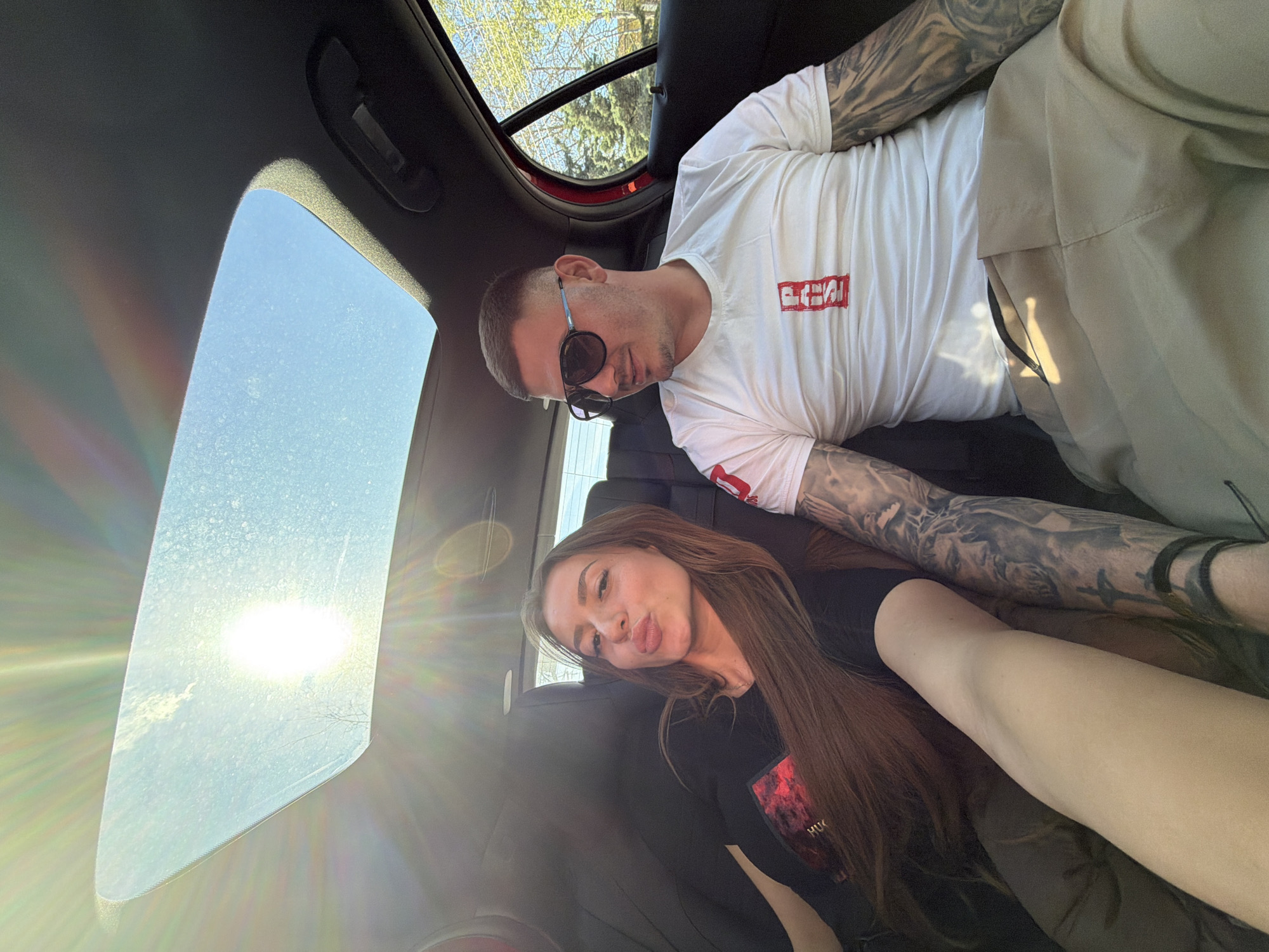A couple is taking a selfie inside a car, possibly parked. The man is wearing sunglasses, a white T-shirt, and khaki pants. He has tattoos on both arms. The woman is wearing a black T-shirt and has long, brown hair. The car has a sunroof, through which sunlight is visible. The location appears to be outdoors. The setting does not permit definitive identification of the location as being in Serres, Greece.