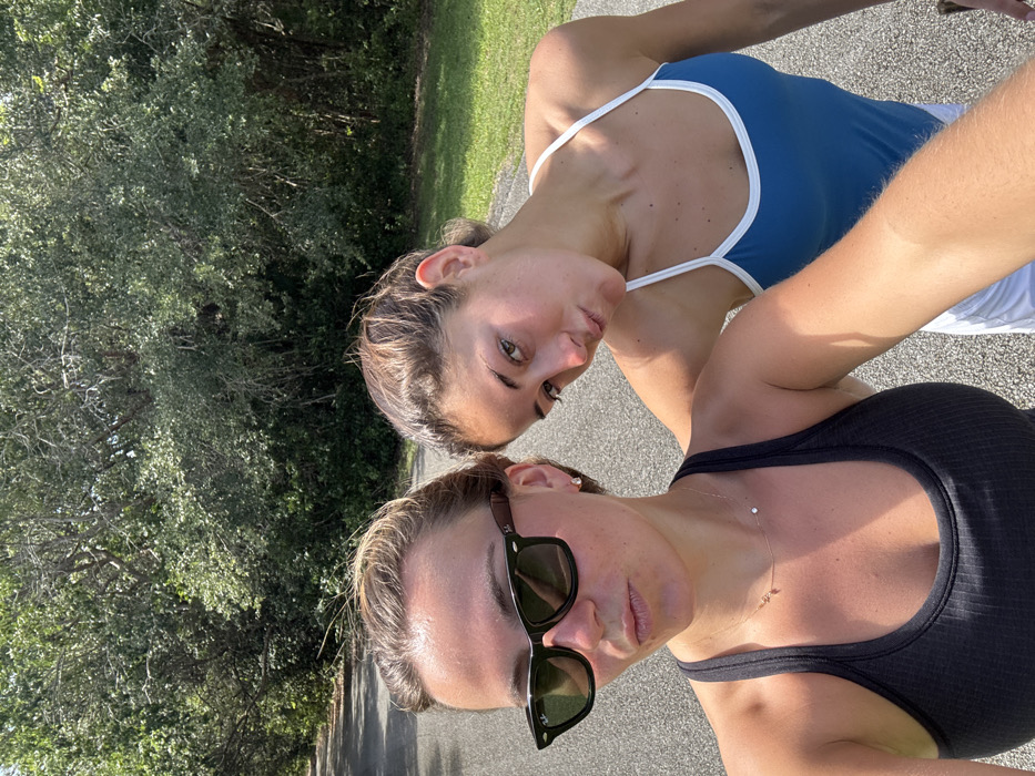 A selfie photograph depicts two young adult females on a paved path in Palmetto Bay, United States