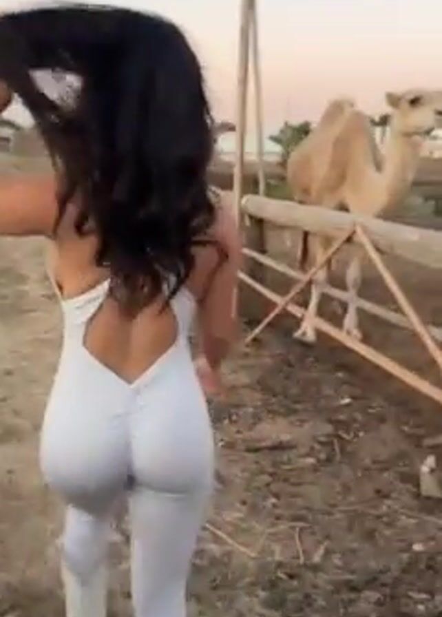 A woman with long dark hair, wearing a light-colored jumpsuit and boots, walks toward a wooden fence. Behind the fence is a dromedary camel. The woman reaches out and gently scratches the camel under its chin. The camel lifts its head slightly. The background is a dusty, rural landscape under a pale sky.