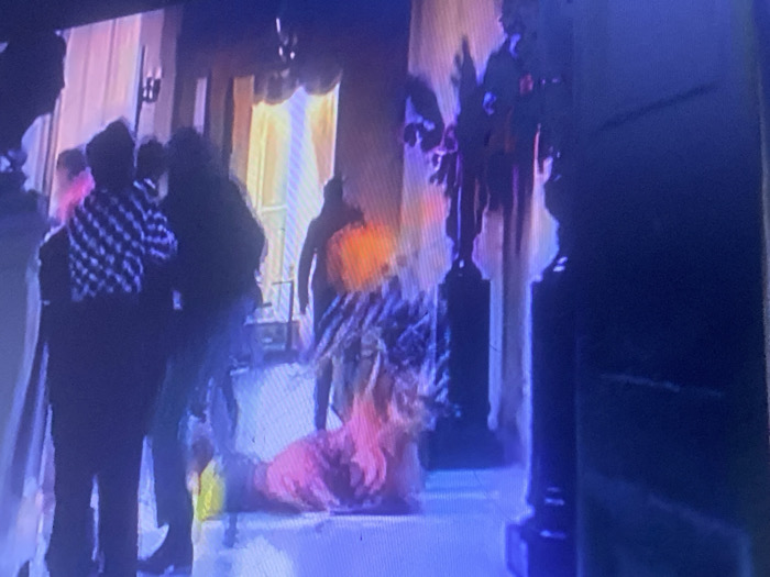 A blurry image shows a group of people inside a decorated building. A person in a pink outfit is lying on the floor near the center. Other figures are standing around or behind, partially obscured. In the background, there are ornate decorations, including what appears to be a statue and draped curtains. The overall impression is of a chaotic or dramatic scene.