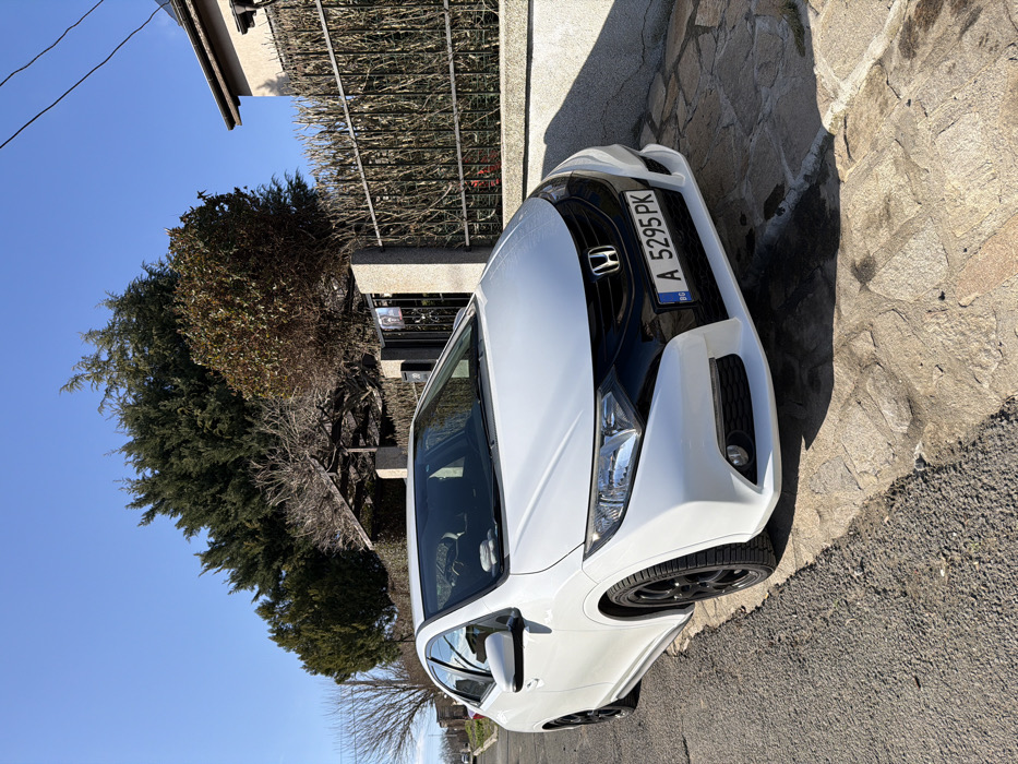 A white Honda Civic hatchback, specifically a 9th generation model (FK/FN chassis), is parked on a paved residential street in Marinka, Bulgaria