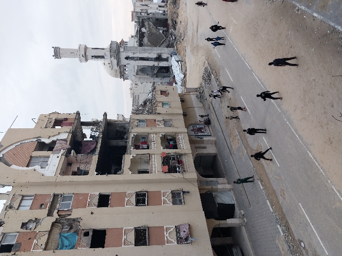 This image depicts a street scene in Khan Yunis, Palestinian Territory, under an overcast sky. A multi-story building on the left exhibits severe damage, with large sections of its facade missing, exposing internal rooms and structural elements. Numerous impact marks are visible across its exterior, and some balconies display hanging tarps and laundry. On the right side, a mosque stands with a prominent, largely intact minaret, while the mosque's dome and adjacent structures show significant damage and surrounding rubble. A two-lane paved road, partially covered with dirt and sand, runs through the foreground and midground, featuring faded white lane markings. Approximately 15-20 individuals, predominantly young males, are scattered across the street and sidewalks. Several individuals in the road are positioned in stances suggestive of playing a game, possibly soccer. Other figures are seen walking or standing on the street and sidewalks. On the left sidewalk, a figure in a green jacket stands near the damaged building, and a small group is seated on the ground near a mural on the building's lower level. Debris and rubble are visible along the road's edges and in the vicinity of the mosque.