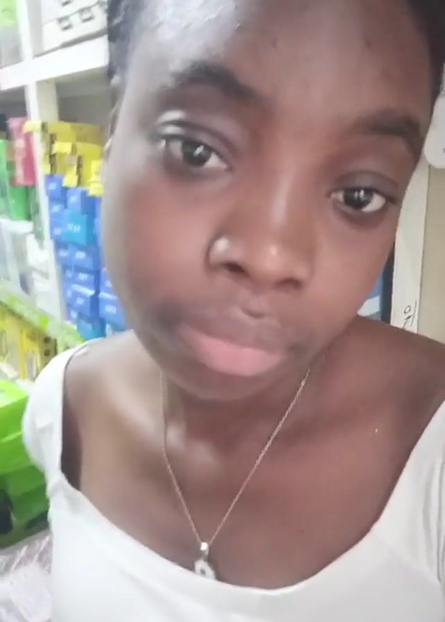 A young Black woman is standing indoors near shelves, wearing a white top and a necklace. She has dark hair styled back, and her expression is subdued. The background shows merchandise on the shelves.