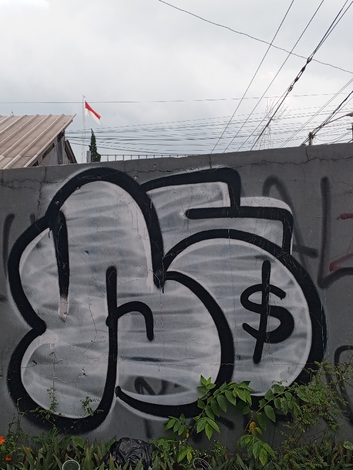 This image depicts a static outdoor scene in the city of Voa Yeav, Cambodia, under an overcast sky. A weathered, light grey concrete wall dominates the lower two-thirds of the frame, exhibiting cracks and areas of discoloration. The wall is covered with large-scale graffiti, featuring stylized, bubble-letter-like shapes outlined in black and filled with grey. One prominent shape includes a black dollar sign ($). Along the base of the wall, green foliage consisting of various plants and leaves grows, with a crumpled black plastic bag visible among them. Above the wall, against the light grey sky, a section of a brown corrugated metal roof is visible to the upper left. A dark green, conical evergreen tree stands behind the roof. To the right, a red and white horizontal striped flag, consistent with the flag of Indonesia, flies on a pole. Numerous black utility cables crisscross horizontally and diagonally across the upper portion of the sky, above and behind the wall. A metal railing is partially visible above the wall to the right. No individuals are present in the scene.