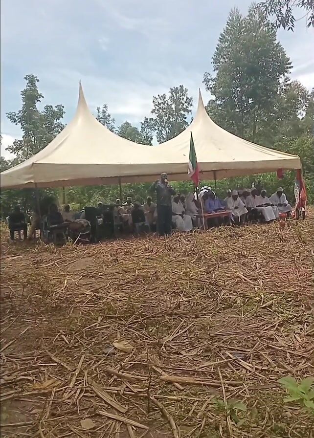 n outdoor gathering of people sitting under a large white tent. The tent has two pointed peaks. A man stands in front of the seated group, speaking into a microphone. A flag with green, white, and red colors is placed near the group. The ground in front of the tent is covered in dry leaves and debris. The surrounding environment consists of trees and a partly cloudy sky.