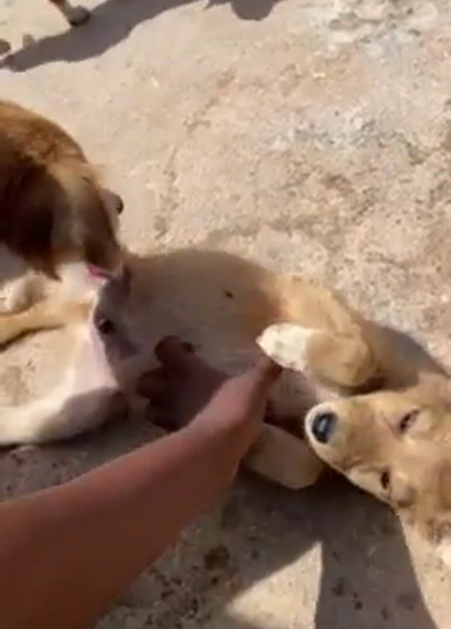A person pets a light brown dog lying on its back outside on concrete. A second brown dog licks the belly of the dog being petted. A third dog walks in the background. The scene takes place outside on a sunny day.