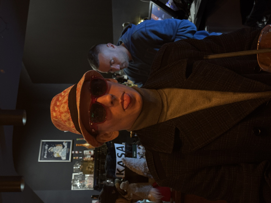 This image depicts an interior scene within a commercial establishment, specifically a bar or cafe located in Budva, Montenegro, identifiable by the Cyrillic "KASA" (Cash Register) sign prominently displayed on the bar counter. In the immediate foreground, an individual, appearing male, is centered, wearing a patterned orange fedora-style hat with a black band, red-framed sunglasses, a light-colored turtleneck sweater, and a dark, possibly plaid, double-breasted overcoat. This individual is making direct eye contact with the camera while extending their tongue in a playful gesture. A clear glass containing a dark liquid and a dark straw is partially visible in the lower right corner, held by the foreground subject. Behind and slightly to the right, a second male individual with short dark hair, wearing a blue hooded sweatshirt, is partially visible. This individual is oriented away from the camera, looking downwards or to the side, appearing engaged in an activity behind the bar counter. The background elements include a dark-colored bar counter, above which multiple bottles of various beverages, glass jars, and decorative items—including a red-hatted gnome-like figure—are arranged. A framed picture hangs on the dark wall behind the bar. To the right, a digital screen (possibly a point-of-sale system) and subtle string lights are present. The establishment features dark walls and ceiling, with visible recessed lighting fixtures, contributing to a dim and atmospheric environment.