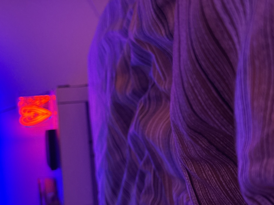 The image features draped fabric in shades of purple and brown, creating a flowing, textured effect. The fabric is densely layered, with vertical lines adding depth. A neon heart-shaped light with an orange glow is attached to the wall in the background, casting a blue and purple light across the scene. A white object, possibly a shelf or cabinet, is partially visible behind the light.