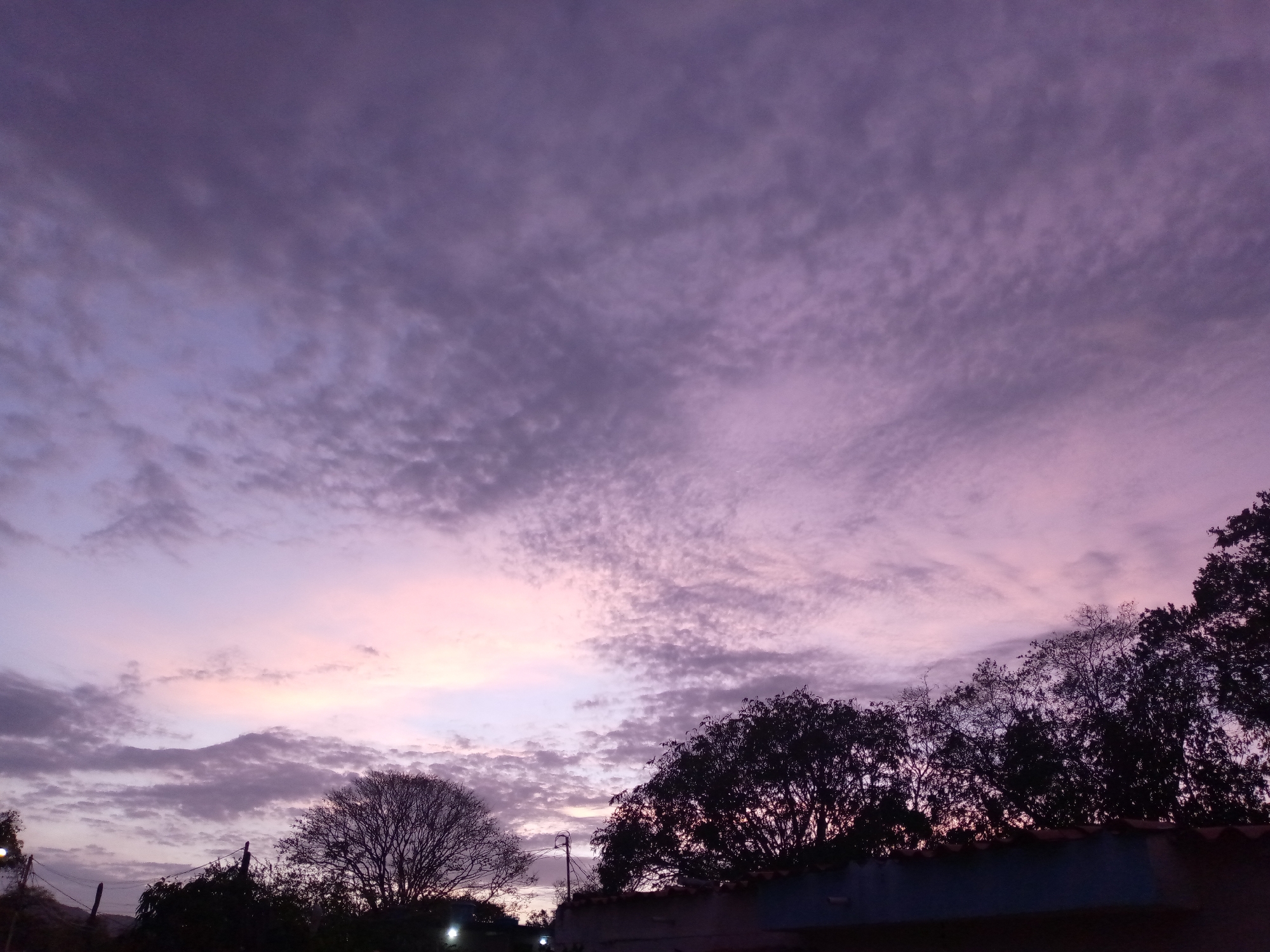 The image captures a sky with a gradient of colors ranging from dark purple to light pink and white, indicating either a sunset or sunrise. The sky is filled with small, patchy clouds. At the bottom of the image, there are silhouettes of trees and what appears to be the roof of a building. Light from street lamps is visible behind the trees. The city is Juan Griego, Venezuela. There are no visible people in the image.