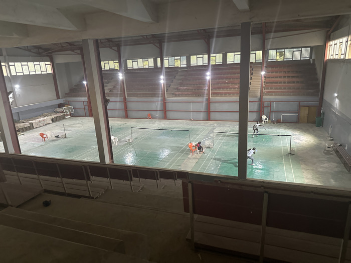 A high-angle shot captures an indoor badminton court during a game. Two players are actively engaged while others sit and observe. The court is lined, with nets erected between the players. Bleachers surround the court, with ample overhead lighting illuminating the scene. A basketball hoop stands on the left side of the image, and construction debris is visible near the hoop. The setting looks like a public indoor recreation facility.