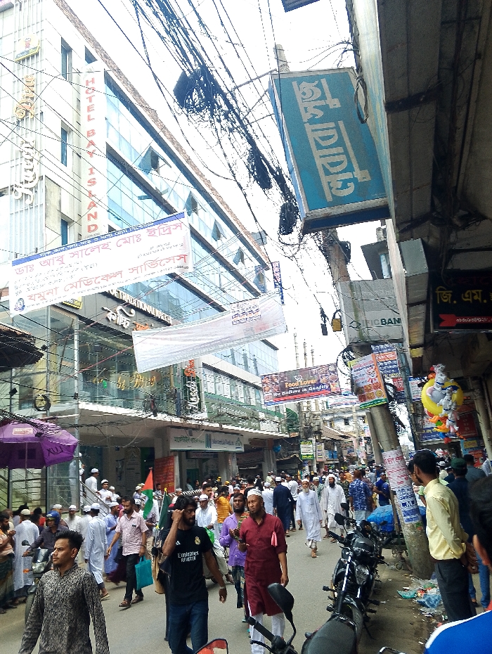 busy street scene in Bhola, Bangladesh, located at 22.685 latitude and 90.644 longitude. The street is lined with shops and buildings, some of which have signs in Bengali. There are many people walking on the street, including men in traditional clothing and women with covered heads. The street is crowded with motorcycles and other vehicles. The street is narrow and the buildings are close together, creating a sense of claustrophobia. The air is polluted with dust and smoke. There are many power lines and wires overhead. The scene is chaotic but vibrant.