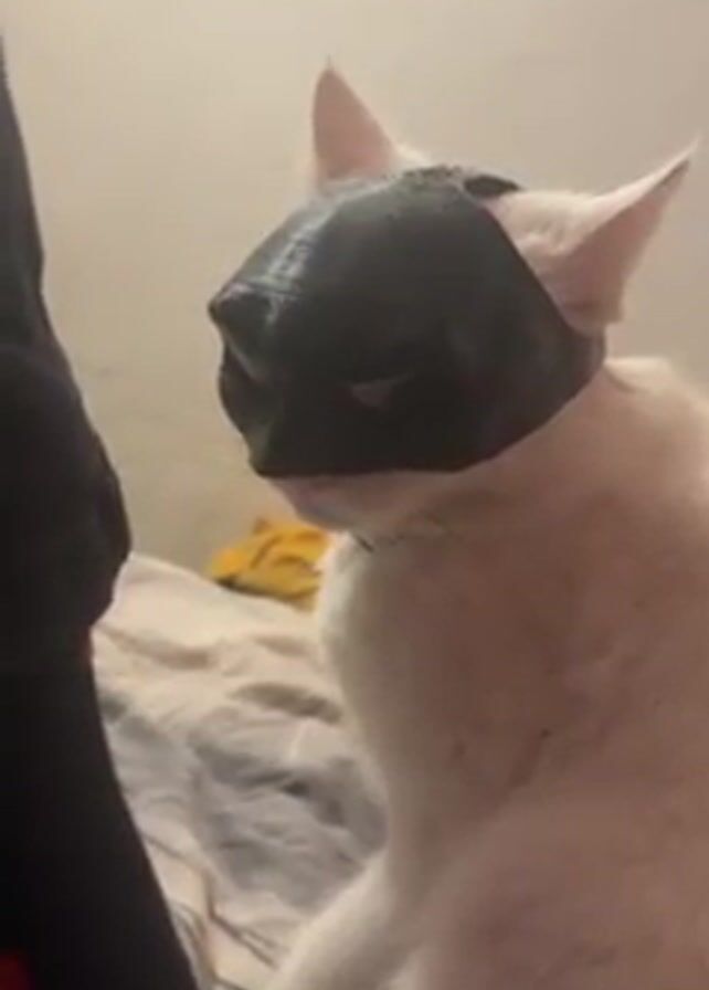 white cat wearing a black Batman mask