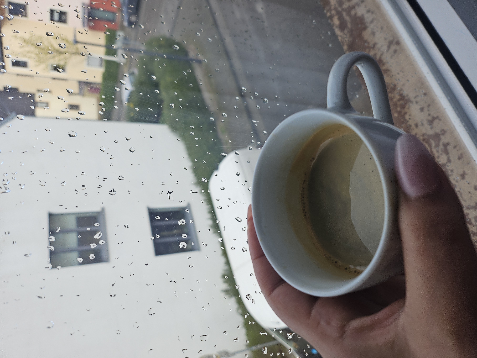 A high-angle shot shows a white mug of coffee held in a person's hand, with a rainy window and building exterior visible in the background