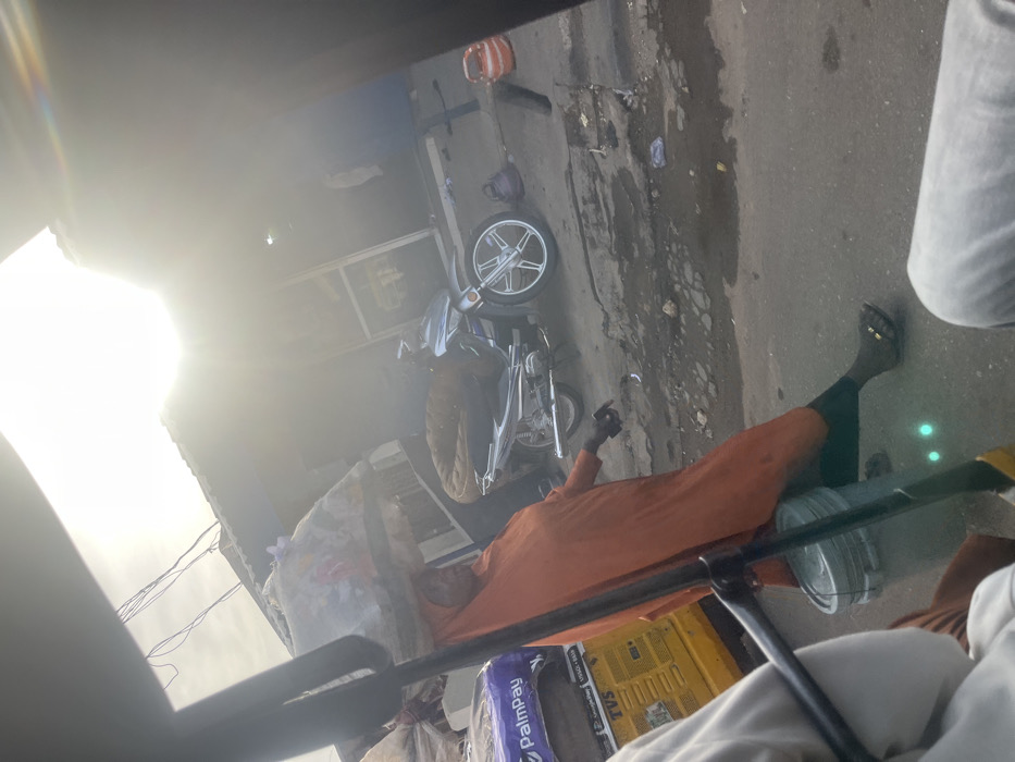 The image captures an outdoor street scene in Shaba, Nigeria, viewed from inside a vehicle. A person, appearing to be a woman, walks from right to left in the mid-ground, wearing a long orange garment and black leggings, with dark sandals. She carries a large, light-colored, irregularly shaped bag filled with various items balanced on her head. A grey bucket is positioned near her left foot, and she holds a small, dark object in her right hand. To the immediate left of this individual, a yellow structure displaying "PalmPay" and "TVS" branding is partially visible. In the background, a silver-colored motorcycle with distinctive spoked wheels is parked on an uneven, dark grey ground surface exhibiting cracks and debris. Behind the motorcycle, a single-story building with a dark facade, a corrugated roof, and a screened doorway is visible. To the right of the motorcycle, on the ground, are a small purple bag and an orange gas cylinder. Power lines extend across the upper-left sky, which is bright and partially overexposed due to intense sunlight originating from the upper-right. The foreground includes portions of a vehicle's interior, featuring black structural bars and light-colored seat upholstery.