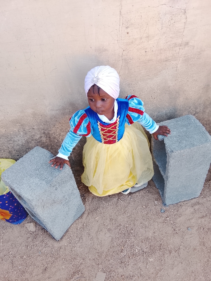 In Gwafan, Nigeria, a young child stands outdoors between two grey concrete blocks on a dirt ground, against a light-colored wall. The child is dressed in a Snow White-style costume, featuring a blue velvet bodice with red and gold lacing, light blue sleeves, and a yellow tulle skirt. A white turban, adorned with a silver-colored, rhinestone brooch, is worn on the child's head. Both hands rest on the concrete blocks, with the child's gaze directed downward and to the left. The ground is composed of dry, light brown soil with small debris. The background wall exhibits minor cracks and discoloration.