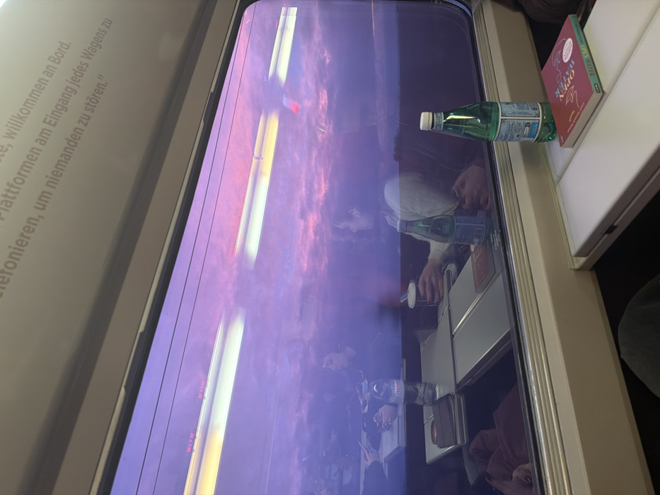 The image, taken inside what appears to be a train, showcases a scenic view reflected in a large window. The reflection captures a colorful sunset or twilight sky, with shades of purple and pink. Inside the train, details like a water bottle and a book are visible on a narrow shelf next to the window. Reflections of passengers sitting at tables can also be seen. In the background, a sign with German text is partially visible, likely containing train-related information or instructions for passengers.