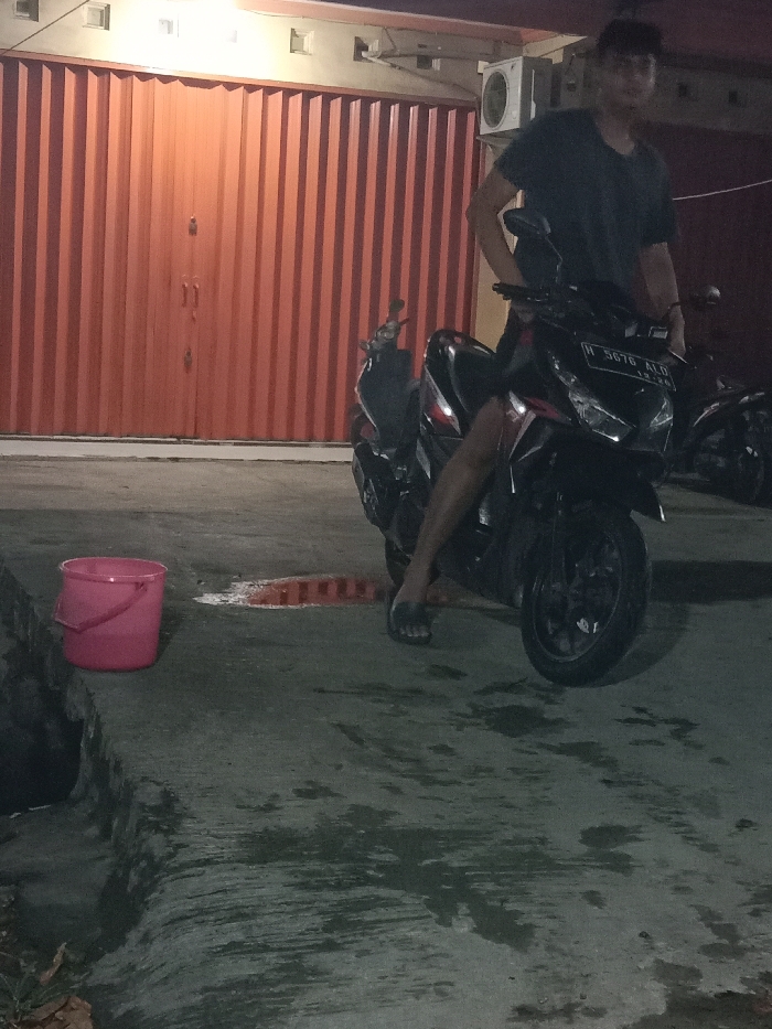 A man wearing a dark grey t-shirt sits on a black motorcycle with a license plate that reads "H 5676 ALO" in front of a closed red garage door in Kecamatan Kaliwungu Selatan, Indonesia. He is wearing flip flops and his right foot is planted on the ground. A pink bucket sits next to him on the concrete pavement. The ground is damp and a puddle of water is in front of the motorcycle. There is a second motorcycle, only partially visible, in the background. The area is lit by a single light source. The scene appears to have been captured at night.