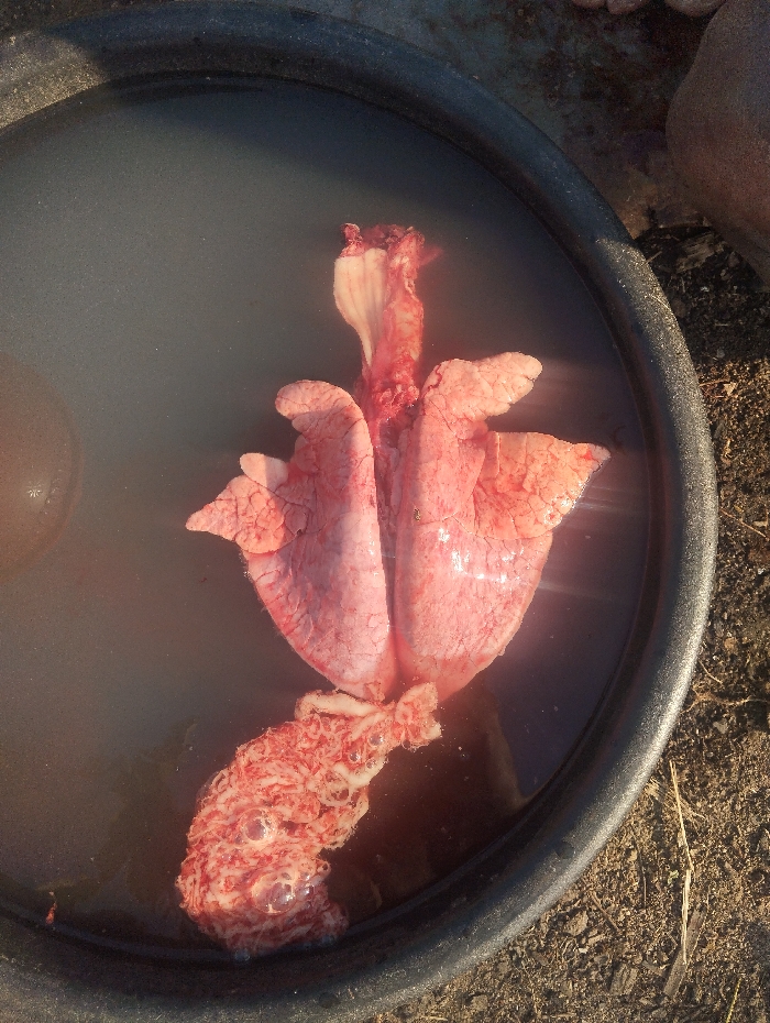 A set of lungs, with the trachea and bronchi attached, sits submerged in a container of water. The lungs are pinkish-red and somewhat translucent. Air bubbles cling to the surface of the bronchi. The water in the container is dark, likely due to blood or other fluids from the organs. A portion of a foot is visible in the upper right corner. The container rests on dirt or sand.