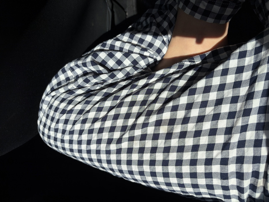 - "A person wearing a blue and white gingham-patterned long-sleeved shirt is depicted close-up" by FM-u4bA12, licensed under CC BY 4.0