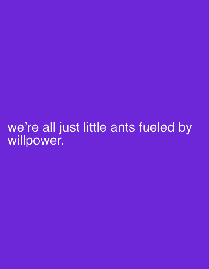 The image is a solid purple background with the text "we're all just little ants fueled by willpower