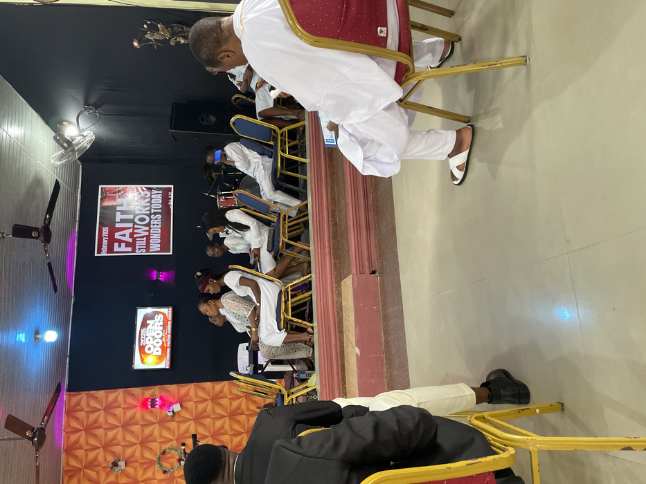 This image depicts an indoor gathering within a hall in Yenegoa, Nigeria, likely a church or event venue. The scene is observed from the audience area, looking towards a raised stage at the back. The environment features a light-colored tiled floor. The left wall exhibits an orange geometric pattern, while the back wall is uniformly black. The ceiling is white, fitted with three dark-brown ceiling fans and several light fixtures, including one emitting a blue glow. On the elevated stage, a large television screen on the left displays "2026 OPEN DOORS" and "HOSTING PASTOR GIDEON AKINB...". To its right, a large white banner against the black wall reads "February 2026 FAITH STILL WORKS WONDERS TODAY" with "Heb. 4:12" below. A microphone on a stand is visible on the stage's left. Two decorative wall lamps with purple light are affixed to the black wall. A black speaker box stands on the right side of the stage, and parts of a drum set are visible behind it. Approximately 10 individuals are visible. In the immediate foreground, facing away from the camera, is a male seated on a red-framed chair with patterned upholstery. He wears a white traditional garment and white open-toed sandals, and is looking down at a small blue booklet. To his left, the back and side of another male are visible, seated on a yellow-framed chair. He wears a dark suit jacket, light-colored trousers, and black boots. On the stage, a row of approximately seven individuals, predominantly women, are seated on yellow-framed chairs with blue backs. Most are dressed in white or light-colored attire. One woman on the far left wears a patterned dress. Another woman has a reddish head wrap. Several appear to be holding items. Further back and to the right among this group, a male in white attire is seated, looking towards the left, with a blue, rectangular object obscuring his face. Additional individuals in white are partially visible further to the right and behind this main group.